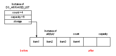 On the other hand, the class DS_ARRAYED_LIST is not very good at inserting or removing items unless they are at the end of the list. This is because the items to the right of the altered position have to be moved either to the right (insertion) or to the left (removal). Also, to avoid too many resizings of the array when inserting items to the list, the allocated space is often larger than the number of items actually held in the list. Therefore you should use DS_ARRAYED_LIST if most of your insertion and removal operations are applied to the end of the list, if you know in advance the number of items that will be held in the list to avoid wasting time resizing the underlying array, and if you often access items by index. Otherwise, and in particular if items are most of the time inserted in or removed from the middle or beginning of the list, singly and doubly linked implementation of list is propably what you need.
