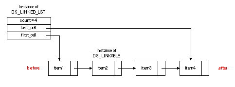 A list of type DS_LINKED_LIST is made up of individual linkable cells, instances of class DS_LINKABLE, each of these cells containing an item of the list and being linked to the cell containing the next item. Following is a simplified graphical representation of the memory layout of a linked list.